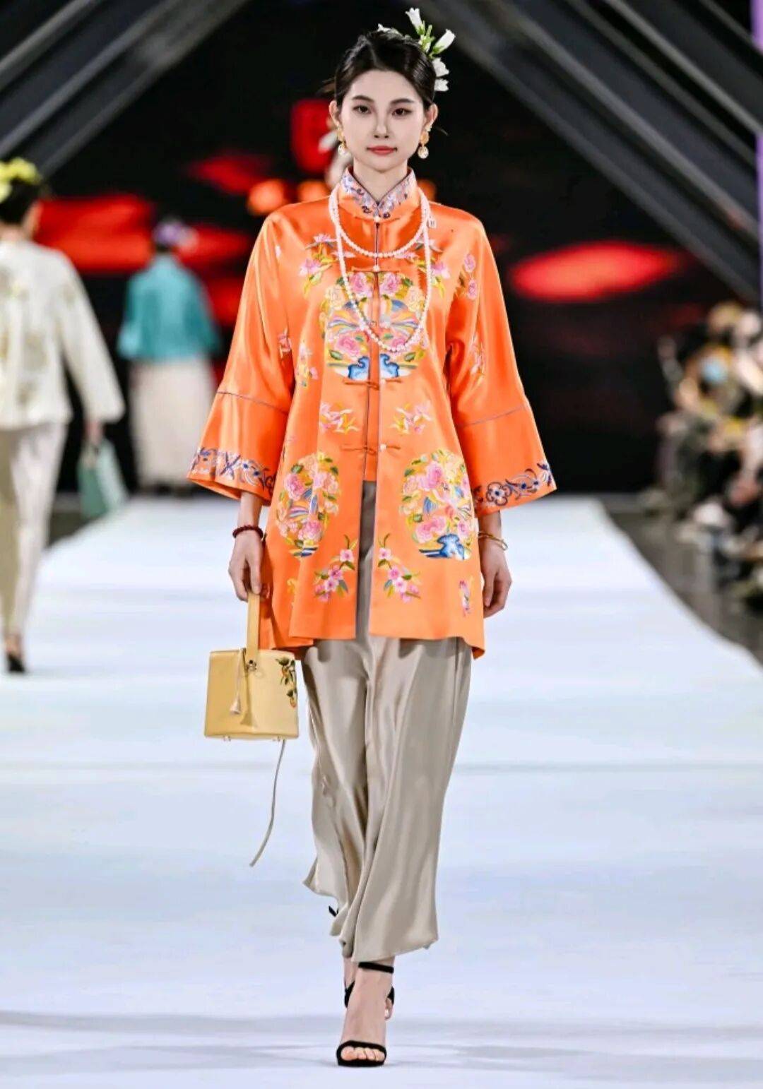 **橙色的中式外套在中长款外套上,这些橙色颜色更多鲜艳温暖,宽松的廓形增加直线的利落线条,一些团花、粉色花纹等装饰,让外套也多了不少图案的活力奢华感。