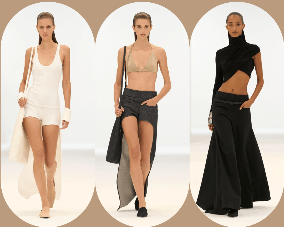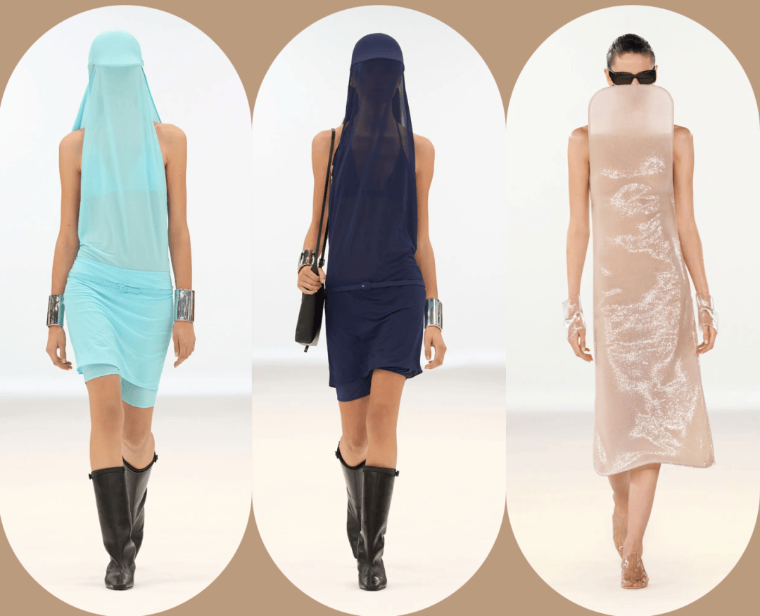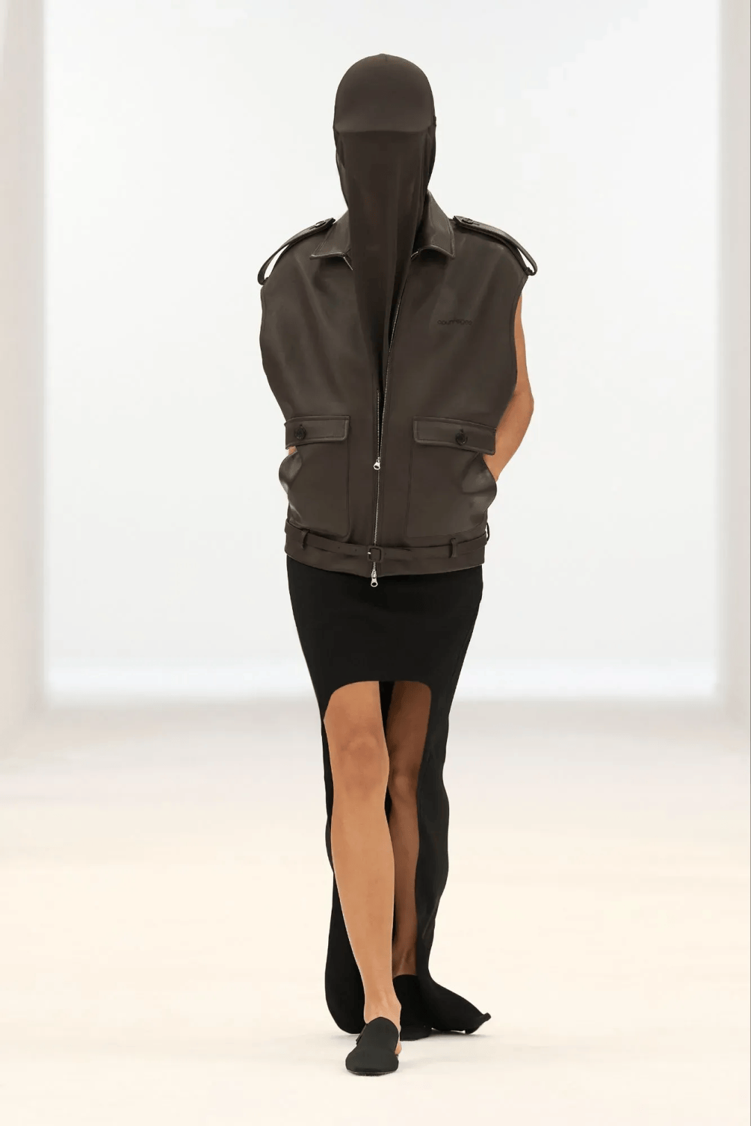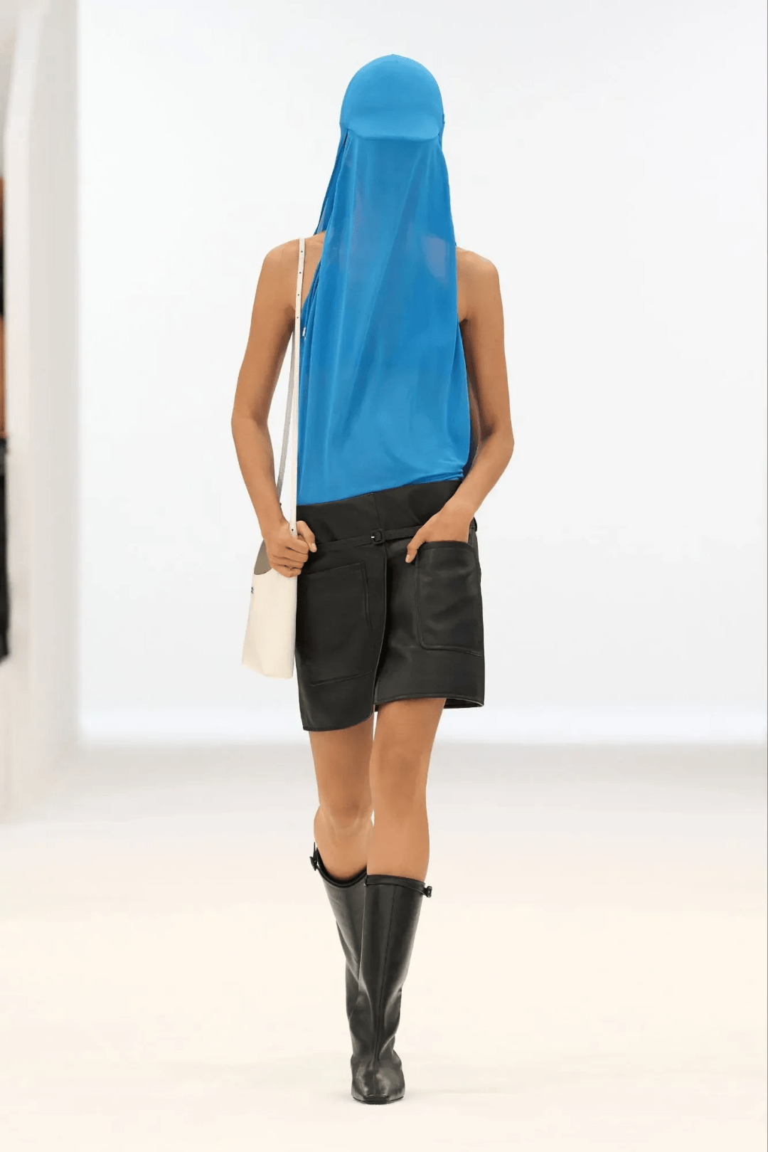 开场造型便定下整个系列基调——五款引人注目的面部遮盖物。远看类似面纱,实则是功能性的紫外线防护罩,垂挂在鸭舌帽上,遮盖住脸部,然后塞进同样面料的A字迷你裙中。 迪·费利切在后台解释,这一灵感来自他在泰国旅行时见到的防晒产品。经过他的重新设计,这种实用物品被转化为时尚配饰,体现了系列核心:服装既是适应环境的防护装备,也是个性表达的媒介。 对于想要完全防晒的人,他推出了带有全脸遮盖面纱的棒球帽,灵感源自品牌档案中的经典造型。这种薄纱材质被塞进迷你裙里,并在侧面开缝以露出配套的比基尼上衣,完美平衡了遮挡与显露的双重功能。