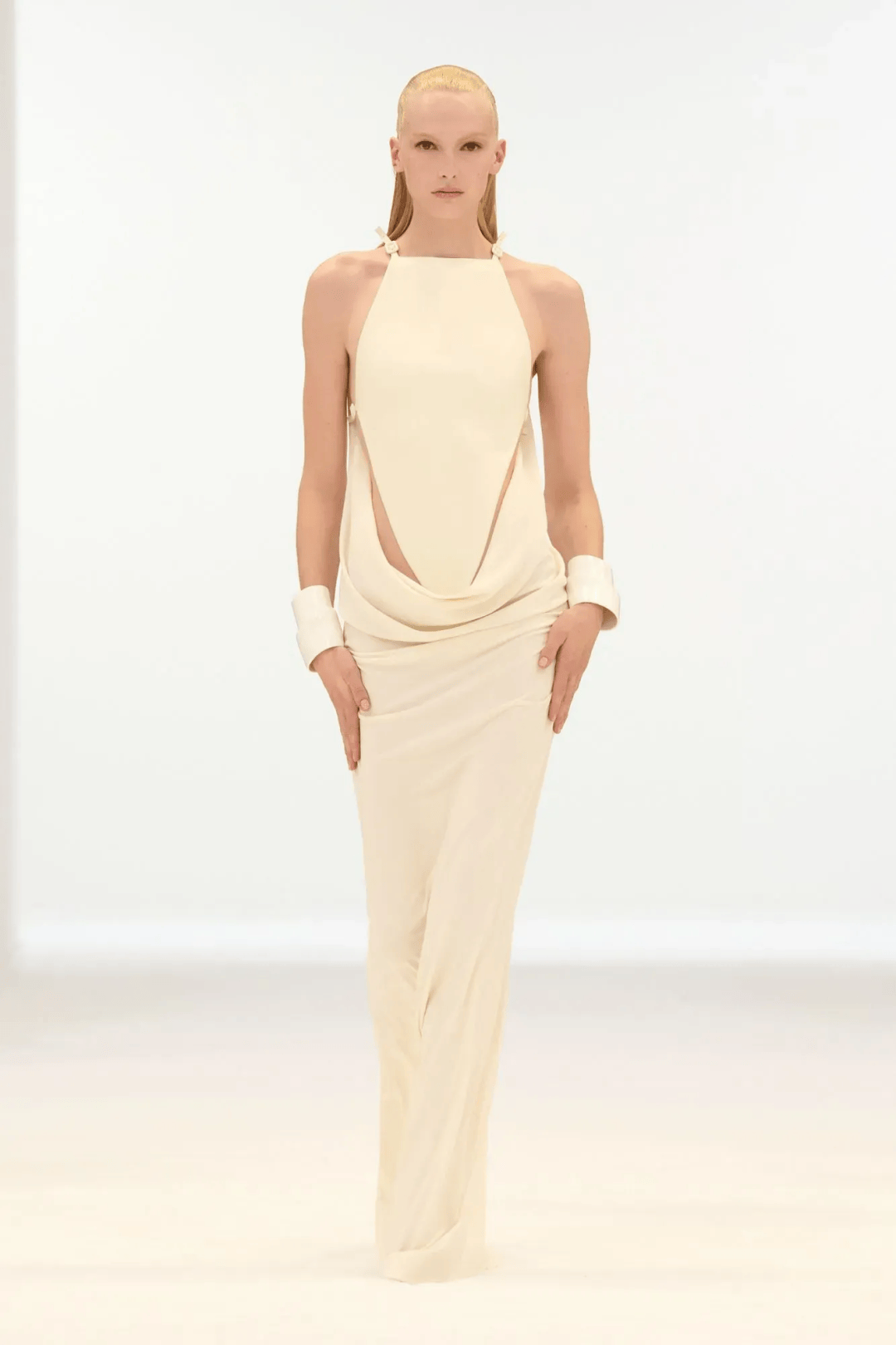 Courrèges本季打破了传统方形秀场空间,将场地设计为一个纯白色的圆形剧场。这一设计由Remy Brière与Matiere Noire共同打造,配合上方一圈地狱般强烈的灯光,随着走秀进程变得越来越亮、越来越热。 没有复杂的布景装饰,唯有头顶无情炽热的灯光,将模特塑造为生存、时尚和感性未来主义的化身。这种极简主义手法刻意强化了观众对温度的感知,模拟了全球变暖下日益炎热的环境。 伴随着Nicolas Di Felice与Erwan Sene创作的原创音乐,秀场气氛层层递进,背景音中甚至穿插着天气预报播报气温上升的消息,直至观者被炽烈光芒所笼罩。这不仅是一场时装展示,更是一次沉浸式的气候现实体验。
