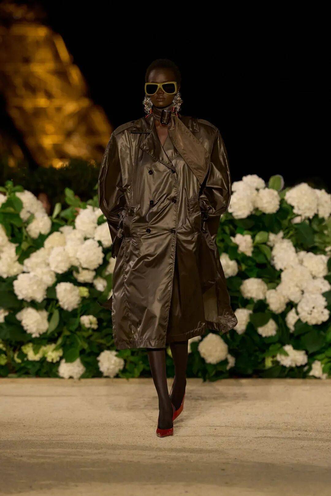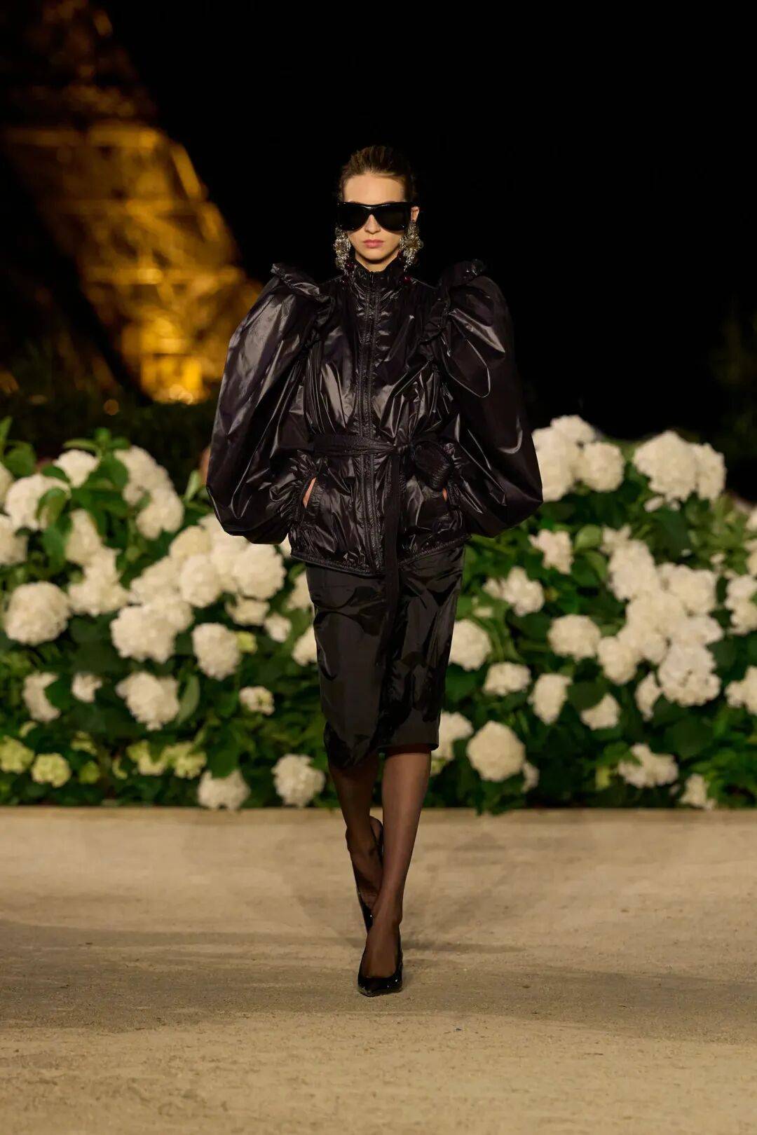Saint Laurent选择在夜幕下的巴黎花园展示2026春夏系列,以埃菲尔铁塔为远景、白绣球花拼成的“YSL”字母为画布,让模特沿着砾石小路行走,皮革机车夹克与低腰西装勾勒出“Louche Aristocrat”(堕落贵族)的轮廓,白色蝴蝶结与金属腰带则暗示着对传统性别符号的颠覆。这种矛盾美学,恰似品牌历史上对“法式慵懒”与“纽约力量”的双重致敬。这种设定不仅致敬了品牌历史,更在当下“传统家庭主妇”形象回潮的背景下,展现出强烈的反叛态度。
