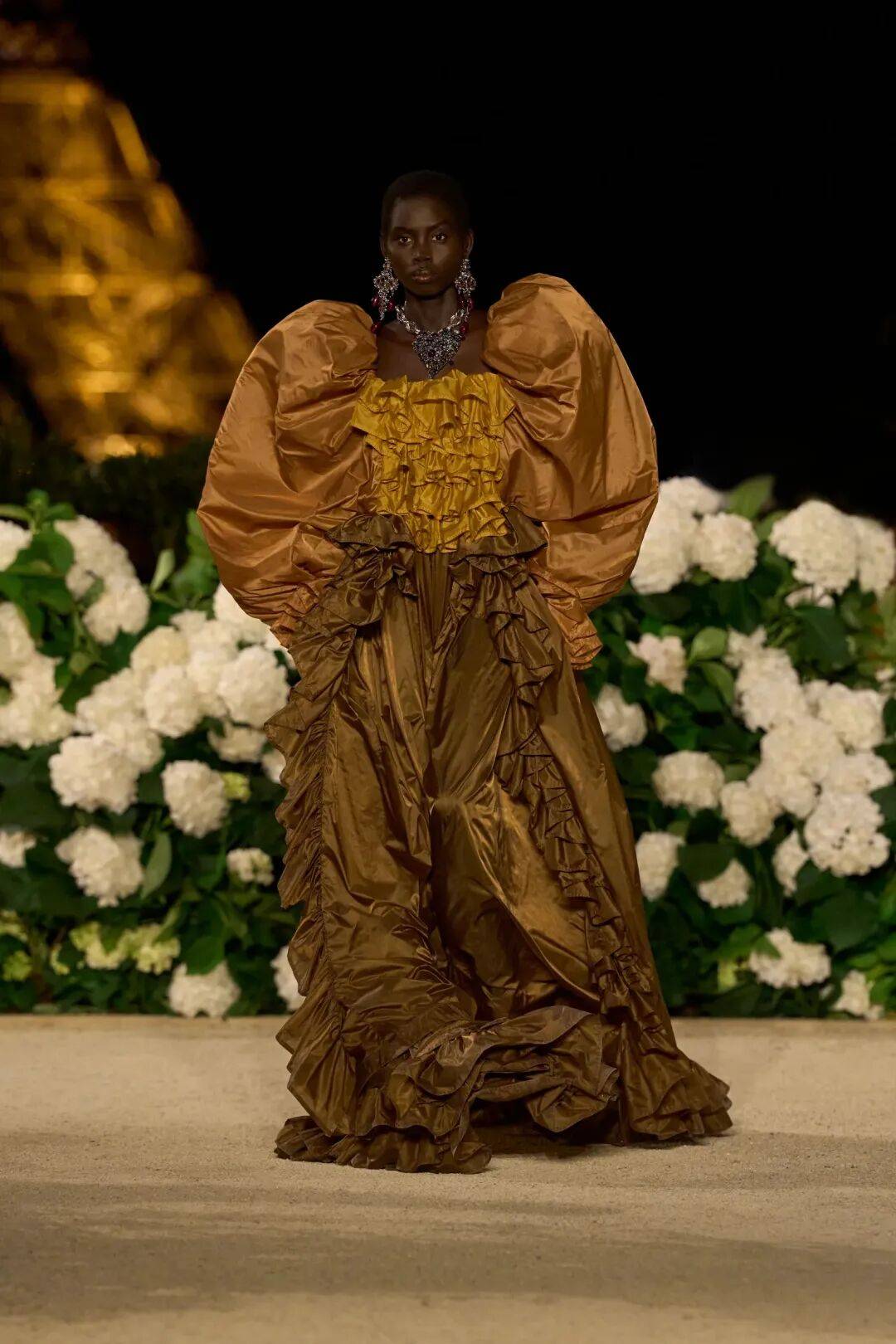 系列的终章,是同样极具圣罗兰精神的、全然浪漫的历史主义风格。那些如浪涛般翻涌的长裙——或许令人忆起伊夫·圣罗兰里程碑式的高级定制秀——同样由尼龙制成。巨大的裙摆与袖笼,胸前激烈的褶皱,一列绚烂的色彩在夜风中流淌。瓦卡莱洛指出,这种材质意味着可以将晚礼服随意揉成一团收纳。
