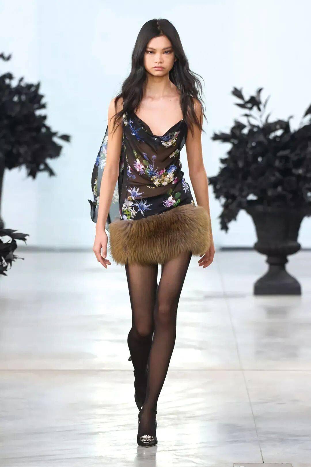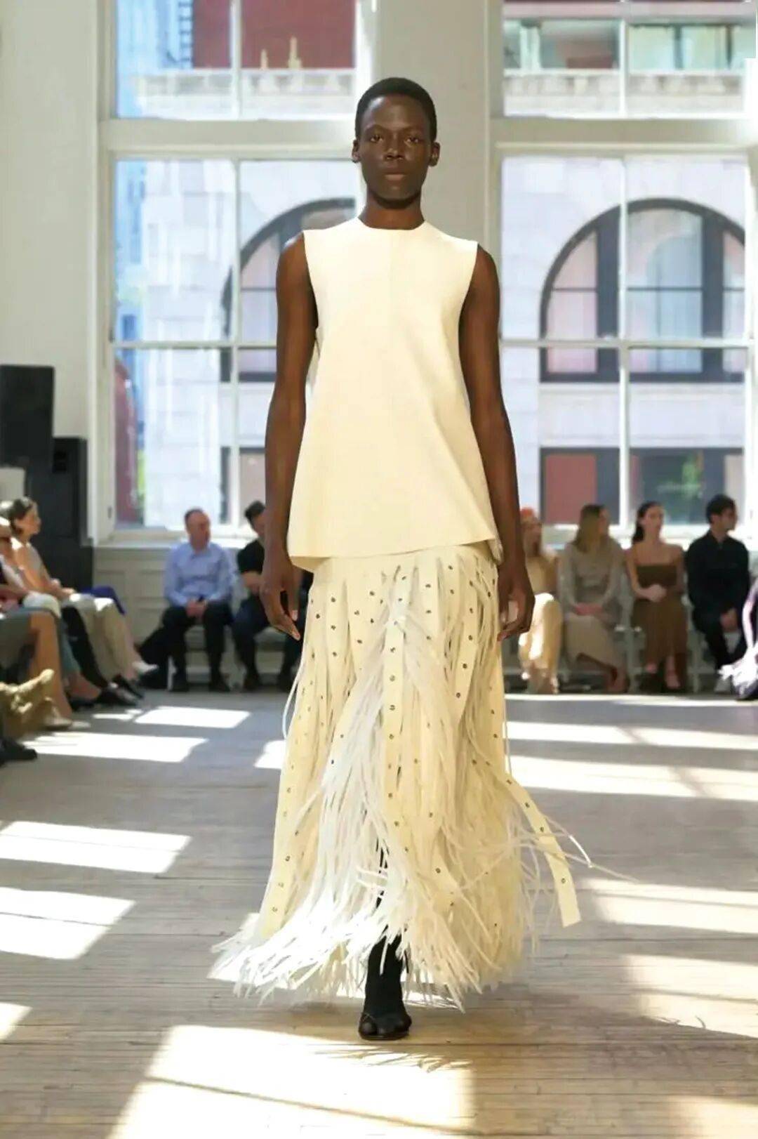 直筒H型剪裁主导日常着装,但通过不对称下摆、立体流苏(如ERDOS的毛线流苏装饰)或开衩设计打破规整。Ashi Studio的抹胸裙以褶皱堆叠营造动态裙摆,刚柔并济。