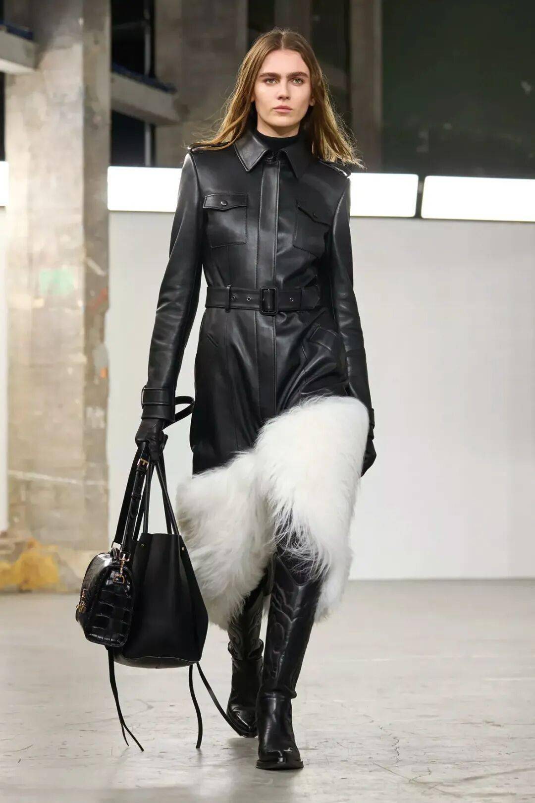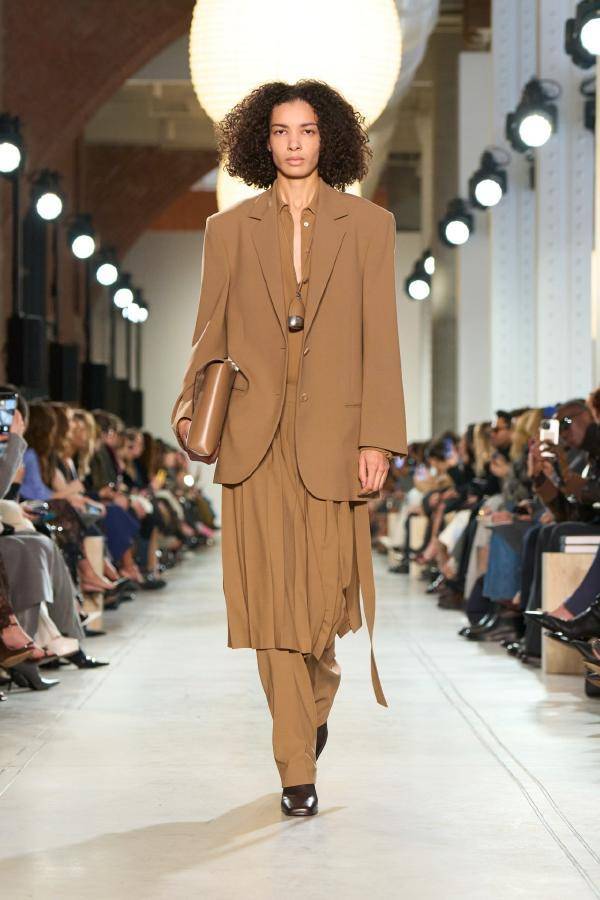 MICHAEL KORS 主打干净利落线条、中性色调以及高科技面料的极简主义风格,宛如时尚长河中的常青树,在时尚舞台上稳稳占据重要地位,持续散发迷人魅力。在秀场上,模特身着驼色套装,宽松的西装外套搭配同色系百褶裙与长裤,线条简洁流畅,中性色调沉稳大气。手中拿着的同色系手包,进一步强化了整体造型的简约感。这种简约纯粹的设计理念,恰似一股清泉,精准契合当下人们对低调品质生活的追求,让穿着者在喧嚣世界中寻得一份宁静与优雅。灰色西装套装同样遵循极简主义,利落的剪裁搭配黑色高领内搭,腰间的黑色腰带为整体造型增添了层次感与精致感,展现出干练的职业风格,无论是商务场合还是日常出行,都能轻松驾驭。