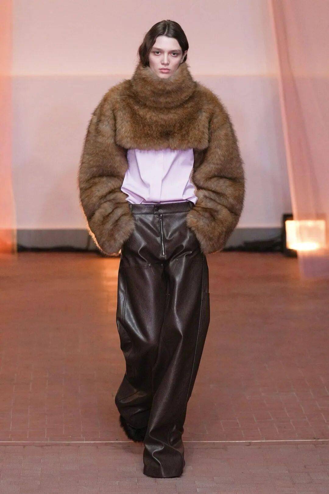 Acne Studios 2025秋冬系列从北欧自然景观中汲取灵感,通过针织、皮质、做旧牛仔等材质的混搭,结合缩短比例的设计(如短款上衣与高腰下装),重塑身体轮廓。这种“自然肌理”与“都市剪裁”的碰撞,创造出独特的视觉张力。极简主义的慵懒垂坠感与未来感的波普色彩(如亮紫、波尔多红)相结合,在自然原始性与都市摩登感之间找到平衡。通过色彩与材质的对比,传递出一种“未完成的精致感”,既保留自然痕迹,又融入现代审美。创意总监Jonny Johansson表示,该系列旨在通过服装表达“对立元素的和谐共存”,如童年记忆中的泰迪熊绒料与都市前卫廓形的碰撞。这种设计哲学不仅体现在材质选择上,更贯穿于整个系列的叙事逻辑中。