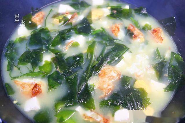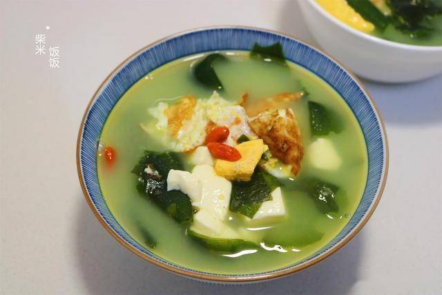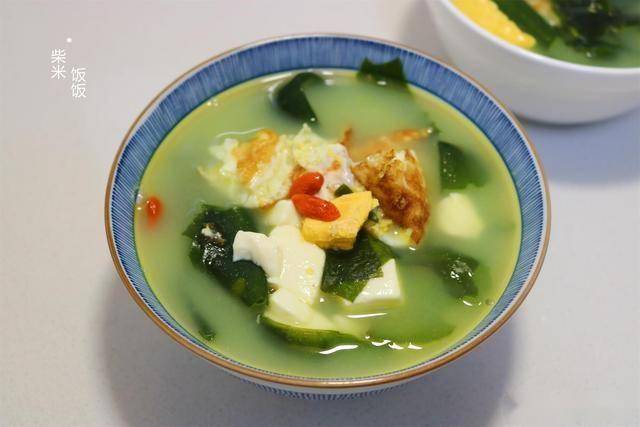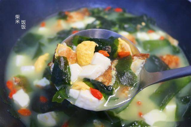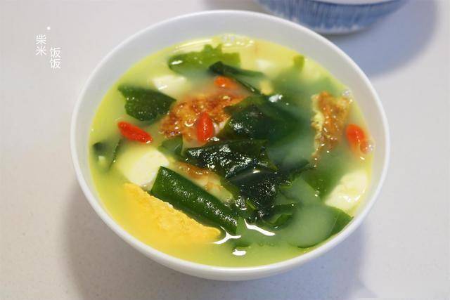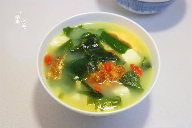 豆腐煎蛋裙带汤 【食材】裙带菜、鸡蛋、内酯豆腐、姜、盐、胡椒粉、枸杞、松茸鲜蔬调味料