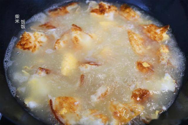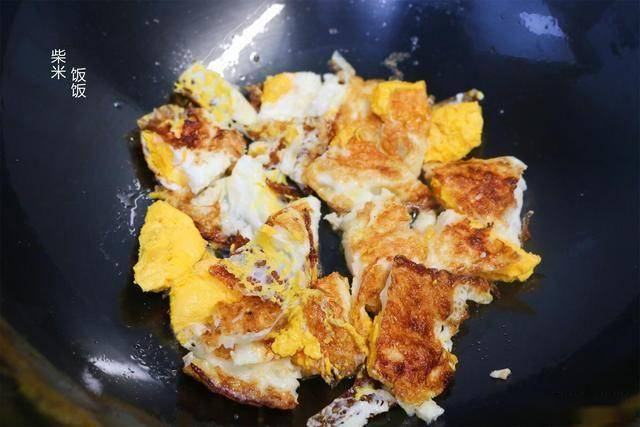 2,热锅凉油,打入几个鸡蛋,煎到两面金黄用铲子铲成小块。