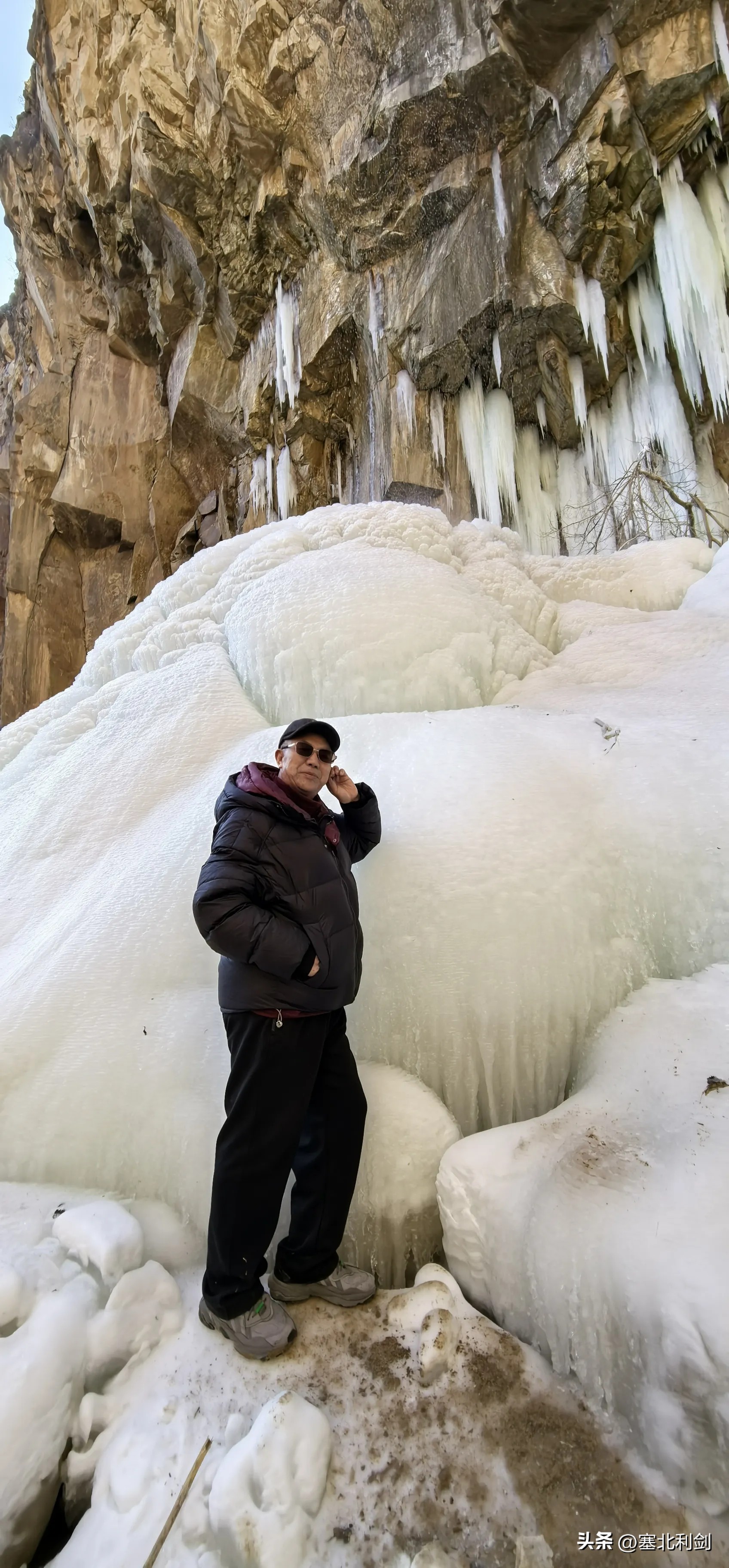 上边那两坨坨冰结多了挂壁承受不住重量,或天气暖和融化,很容易掉下来,存在一定危险性。战友李文平说,有一年他们来此观赏,听得“咵嚓”一声响,我的娘呀,一块巨冰突然掉了下来,冰块四溅,好在人员离崖壁不是太近,没人受重伤。所以,来此玩耍观赏一定要有安全意识,一是不要靠太近,二是逗留时间不要太长。 以下非正文,保存几幅图片: (一)
